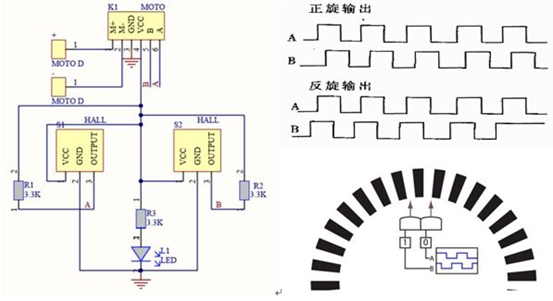 如果两个信号相位相差90度,则这两个信号称为正交。由于两个信号相位相差90度,因此可以根据两个信号哪个先哪个后来判断方向。利用单片机的IO口对编码器的A、B相进行捕获,很容易得到电机的转速和转向。霍尔正交编码器原理,如图6。