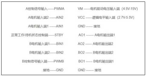 TB6612FNG的引脚定义,如图4所示,引脚分为电源脚、控制输入脚、控制输出脚。