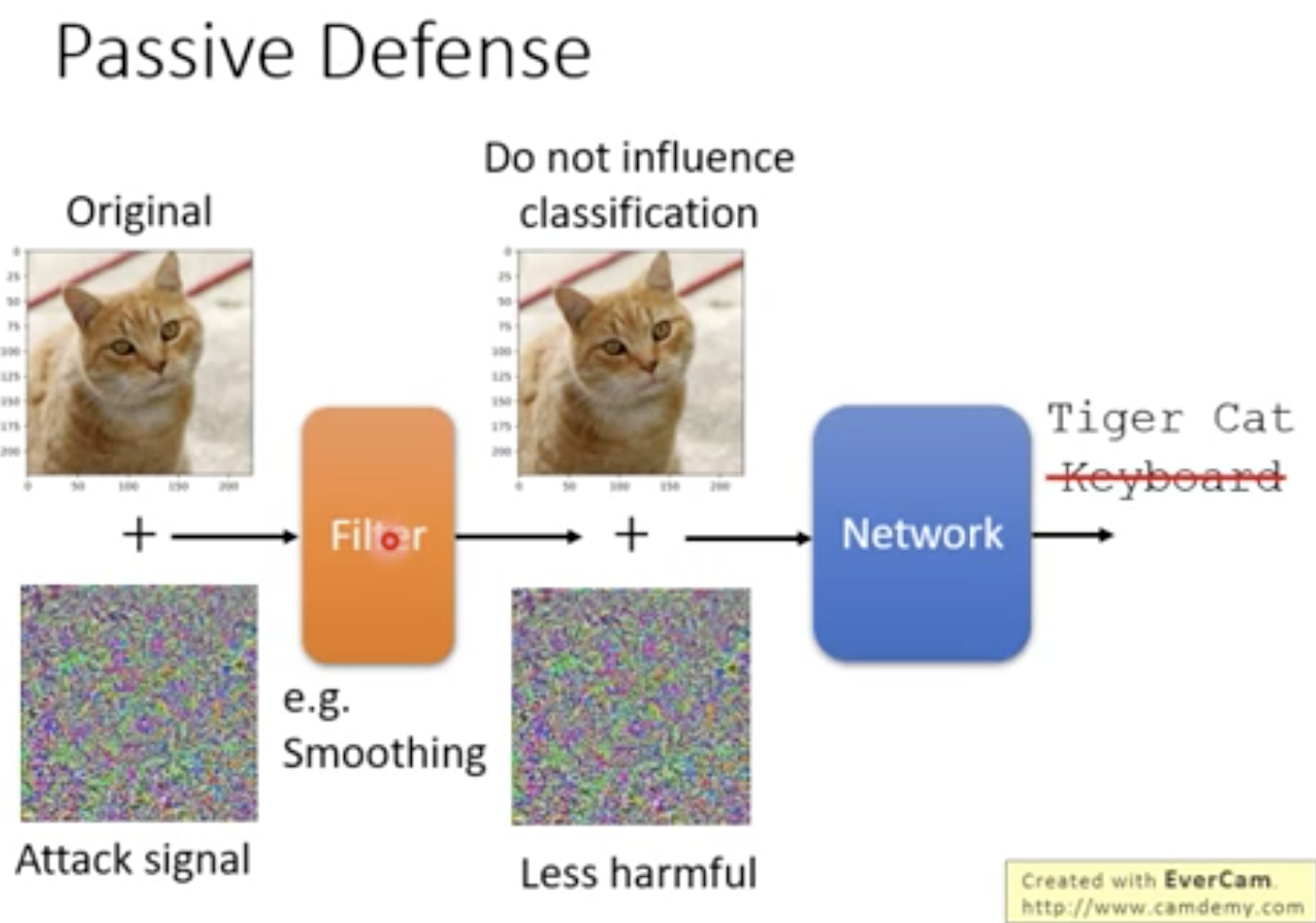 消极防御可以对于图像施加一个filter,减轻噪点对模型的干扰.例如将图像平滑化.原理是对抗攻击一般只在某个方向生效,改变图片即可使这个图像无效.