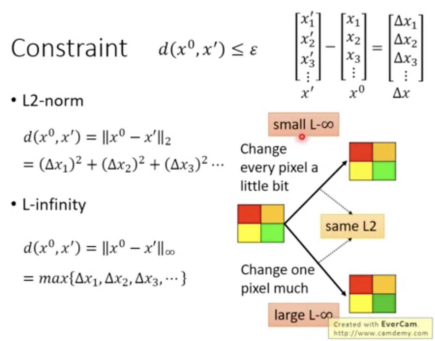constraint:x‘和原图像x0的相似度,必须小于阈值ε.有多种计算方法,如L2-norm,L-infinity,因为取决于人类感知,一般采用L-infinity.