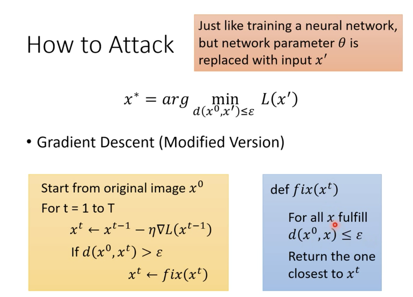对抗攻击即生成对抗样本x’,它要使得损失函数L(x‘)尽可能小,同时确保相似度d(x0,x’)小于ε.