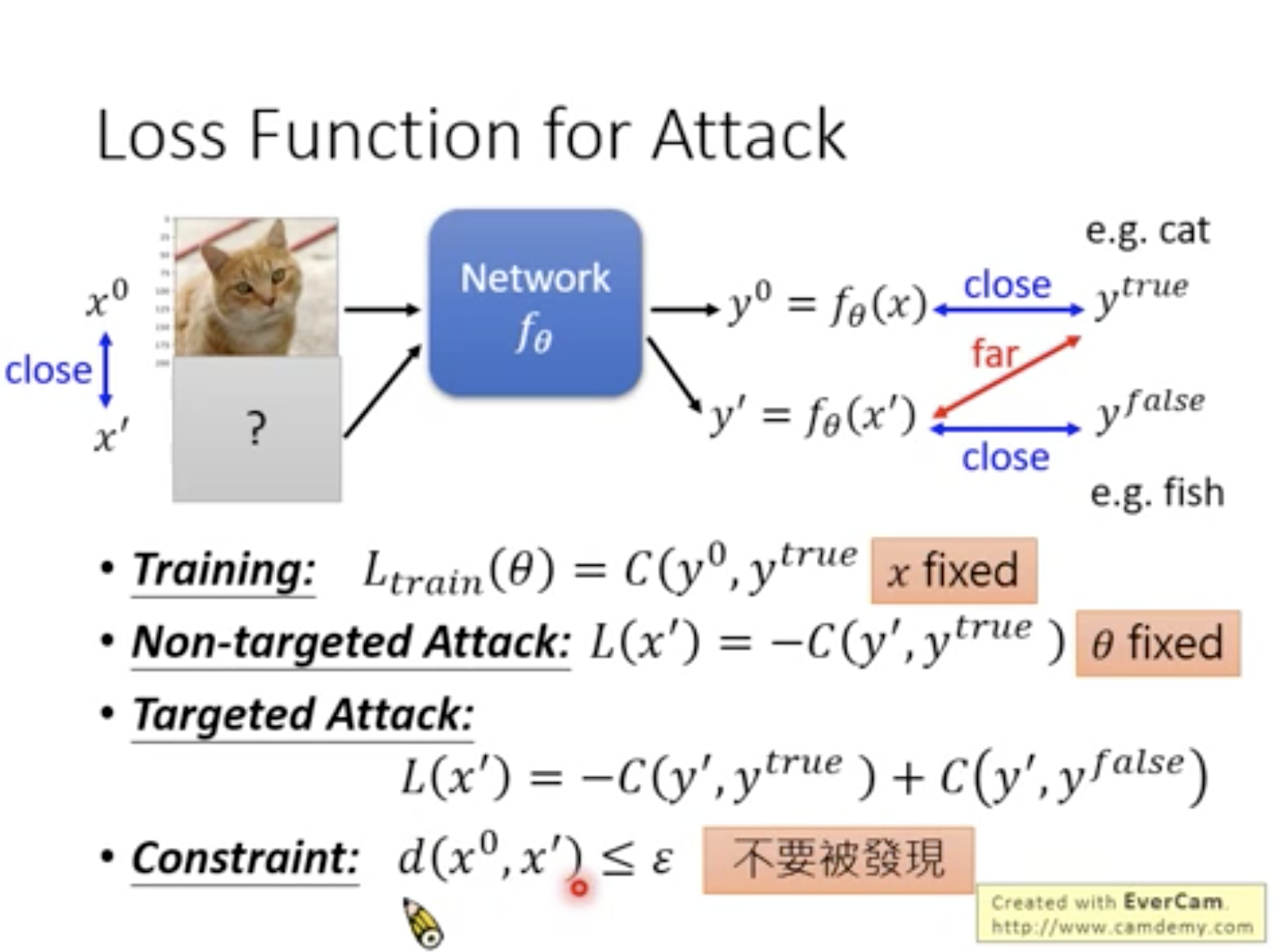 Targeted Attack的Loss:固定θ,修改x,使y‘远离ytrue且接近yfalse.