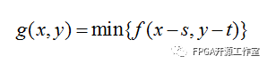 当b的原点位于(x,y)处时,用一个平坦的结构元b在(x,y)处对图像f的腐蚀,定义为图像f中与b重合区域的最小值,即: