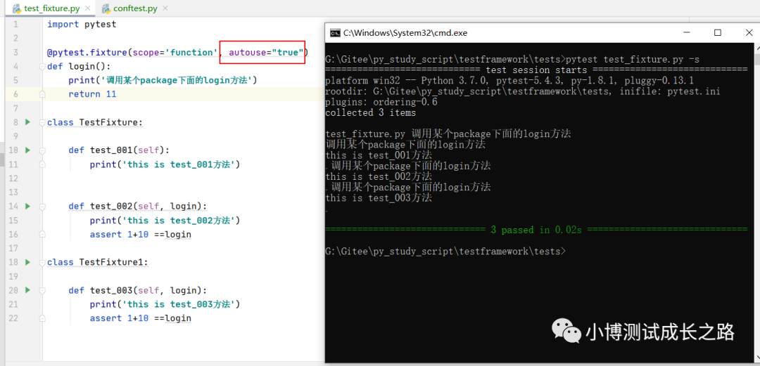如果想让每条测试用例都添加fixture功能,那么可以使用@pytest.fixture里面的autouse参数,autouse='true'则会自动应用到所有用例中。
