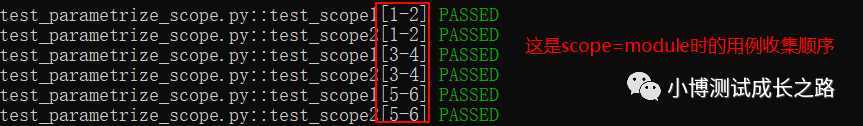 import pytest@pytest.mark.parametrize('test_input, expected', [(1, 2), (3, 4),(5,6)], scope='module')def test_scope1(test_input, expected):pass@pytest.mark.parametrize('test_input, expected', [(1, 2), (3, 4),(5,6)], scope='module')def test_scope2(test_input, expected):pass