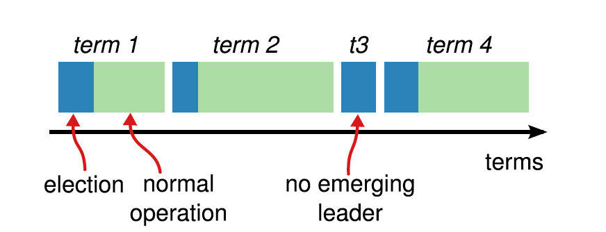 Raft协议将时间分成了一些任意长度的时间片,每个时间片称为term(任期),term使用连续递增的编号的进行识别。任期出现切换的流程如下: