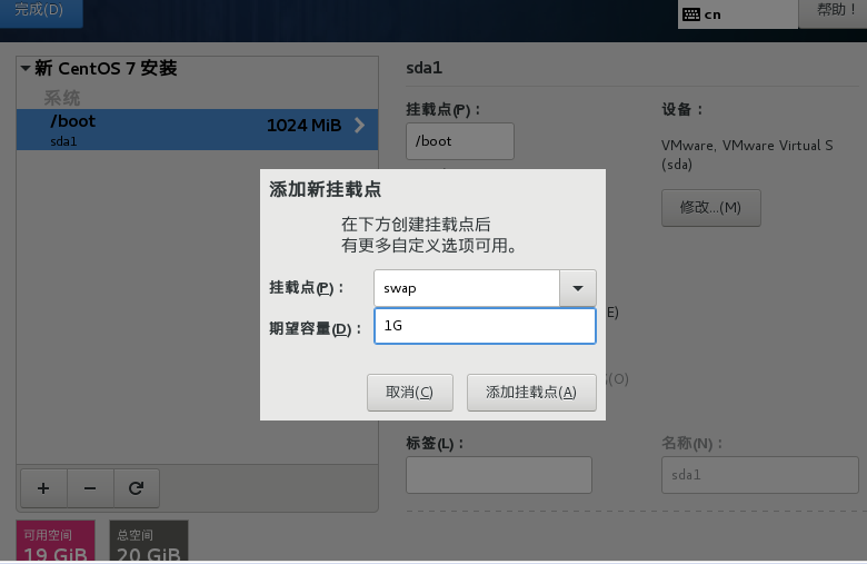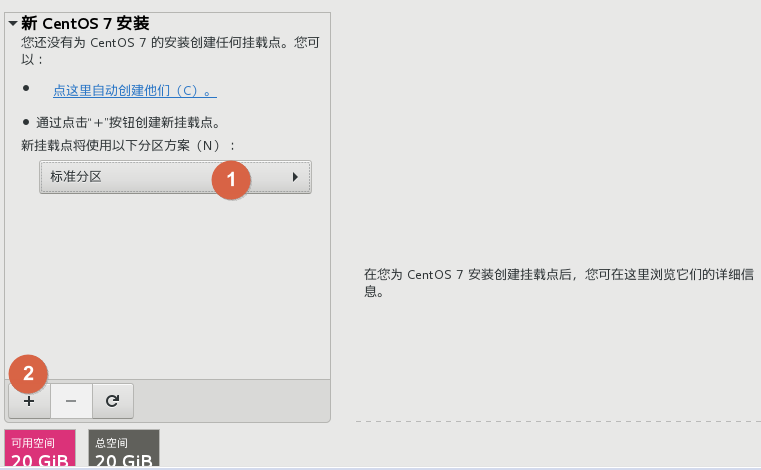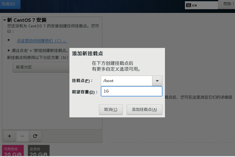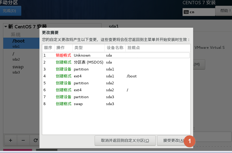 | Tips: 推荐使用自定义分区设置,具体可根据实际情况更改; /boot分区1G; swap分区1G; / 分区:剩余全部空间; |