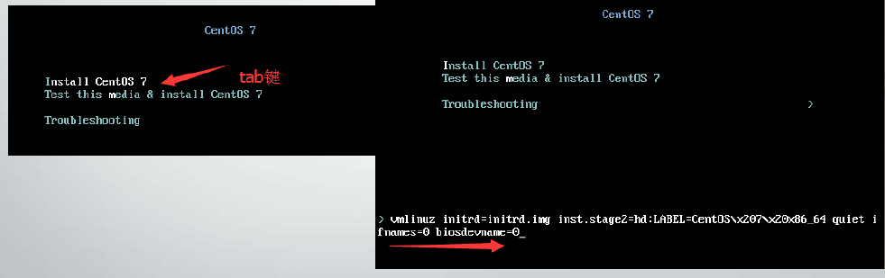 | Tips:CentOS 7与CentOS 6网卡名称命名方式有所改变,如果需要CentOS 7与CentOS 6的网卡名称一样,操作步骤如下: 1) 选择第一个安装方式,并按下tab键,如下图片所示; 2) 输入net.ifnames=0 biosdevname=0,如下图所示: |