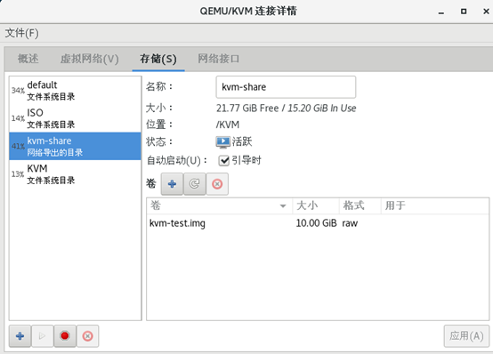 两台KVM连接共享存储:打开虚拟系统管理器界面双击QEMU/KVM 点击 存储 点击 加号