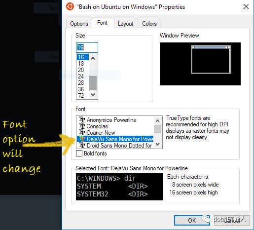 对于windows 10中 WSL 独立的默认Bash窗口,只能选择字体"DejaVu Sans Mono for Powerline",可以在界面上选择后使用。