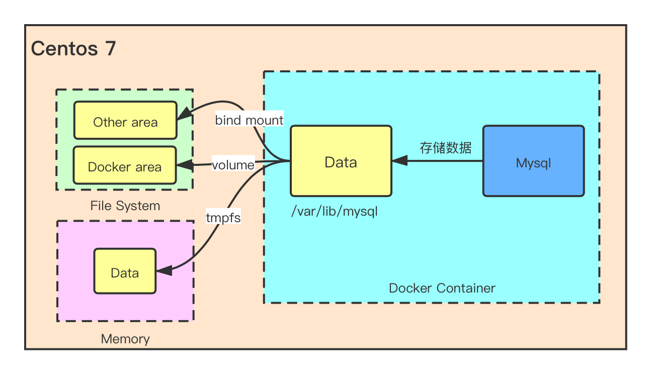 Docker容器对于宿主机器来说只是一个运行在Linux上的应用,因此它的数据存储还是会依赖宿主机器,Docker是通过挂载宿主机文件系统或内存的方式来实现数据存储的,挂载方式有三种:volume、bind mount和tmpfs。