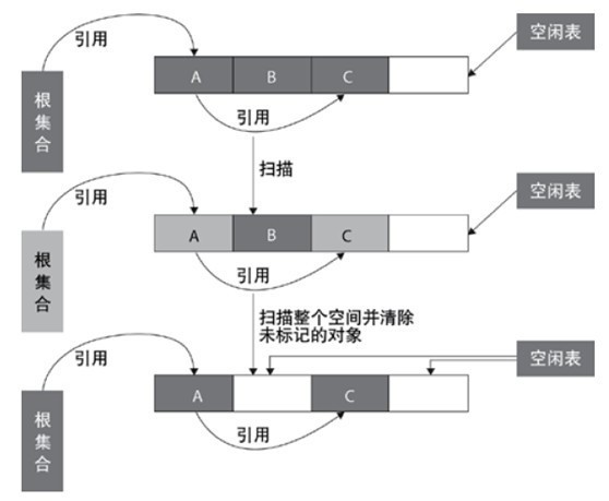 这是最基础的垃圾回收算法,之所以说它是最基础的是因为它最容易实现,思想也是最简单的。标记-清除算法分为两个阶段:标记阶段和清除阶段。标记阶段的任务是标记出所有需要被回收的对象,清除阶段就是回收被标记的对象所占用的空间。具体过程如下图所示: