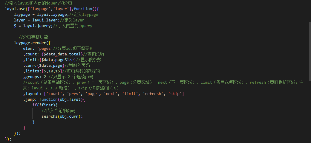 当我点击分页按钮时,我让这个跳转动作执行searchs(),在searchs()中执行跳转,这样就实现的搜索和分页的统一.