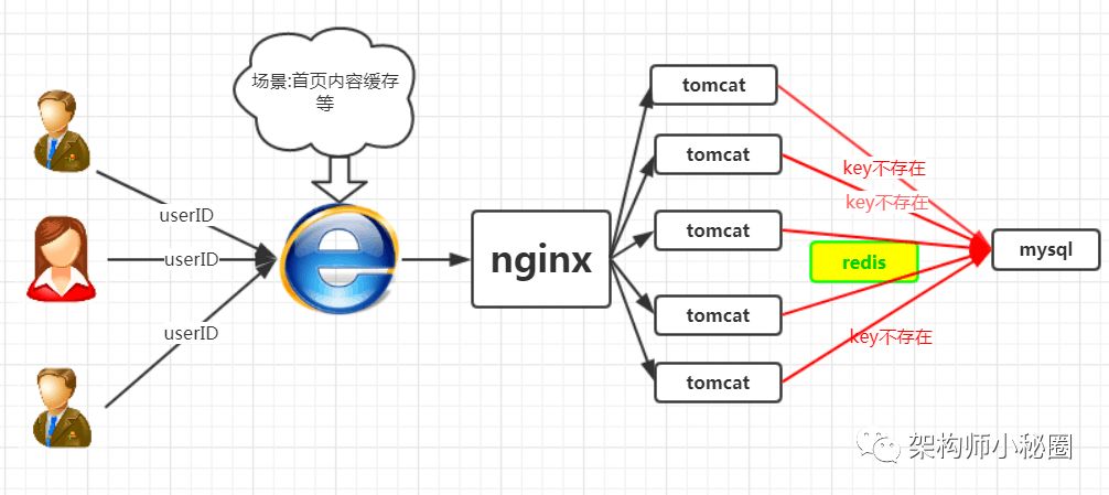 我们正常人在登录首页的时候,都是根据userID来命中数据,然而黑客的目的是破坏你的系统,黑客可以随机生成一堆userID,然后将这些请求怼到你的服务器上,这些请求在缓存中不存在,就会穿过缓存,直接怼到数据库上,从而造成数据库连接异常。