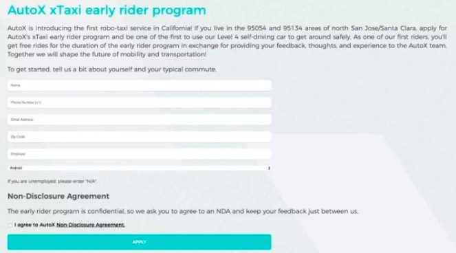 当时AutoX的官网提供成为试运营用户的报名表,图片来自AutoX官网