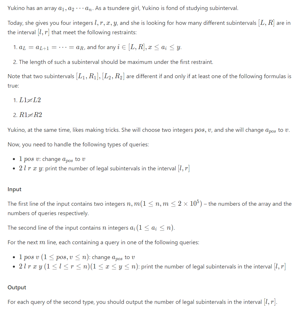 2.询问在区间[l,r]中,有多少个极大子区间满足子区间里的数全部一样,且在[x,y]范围内