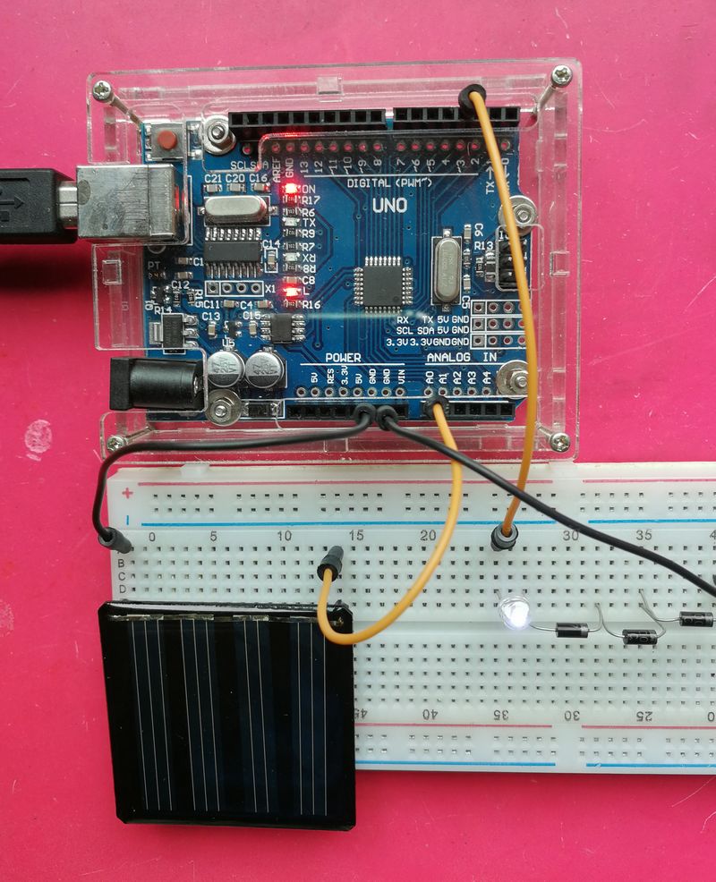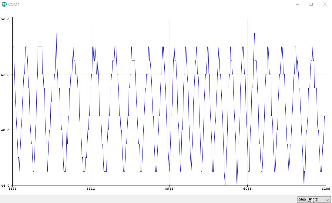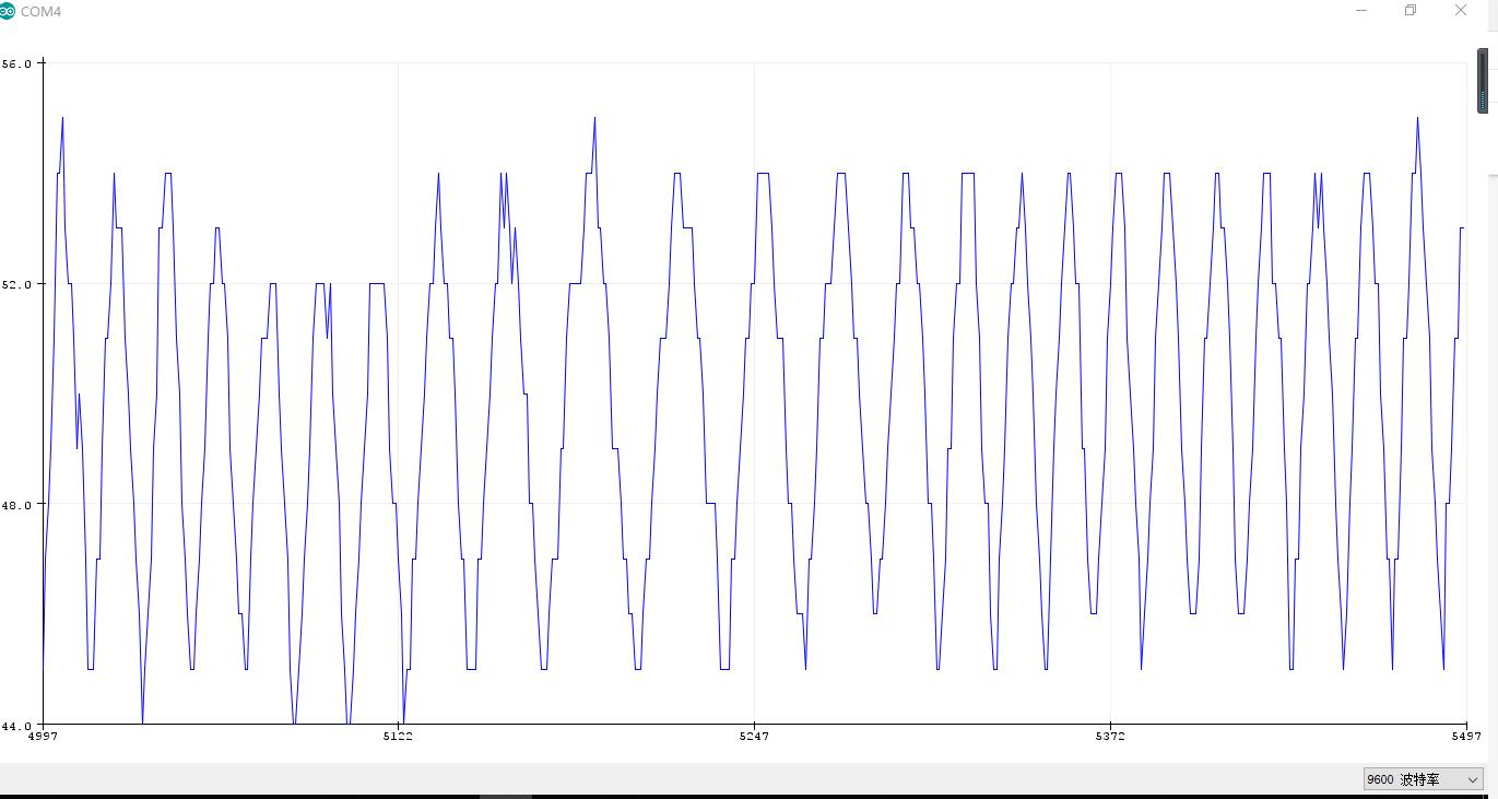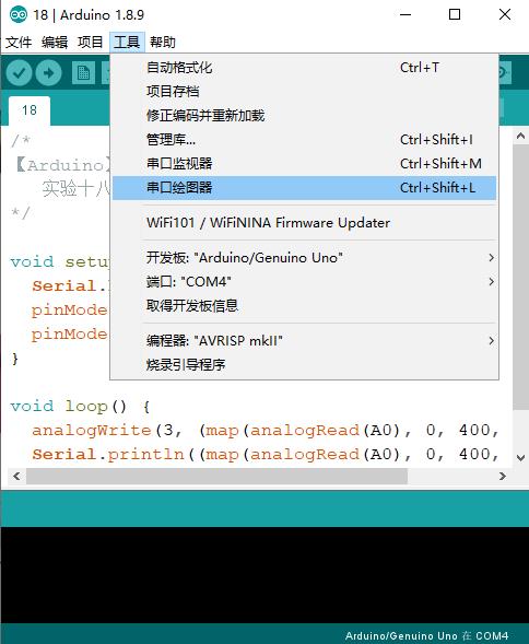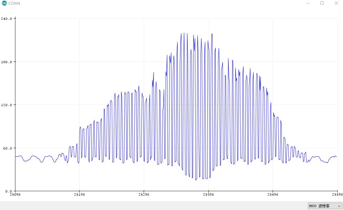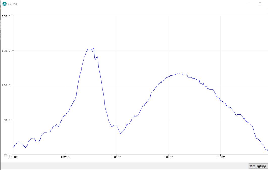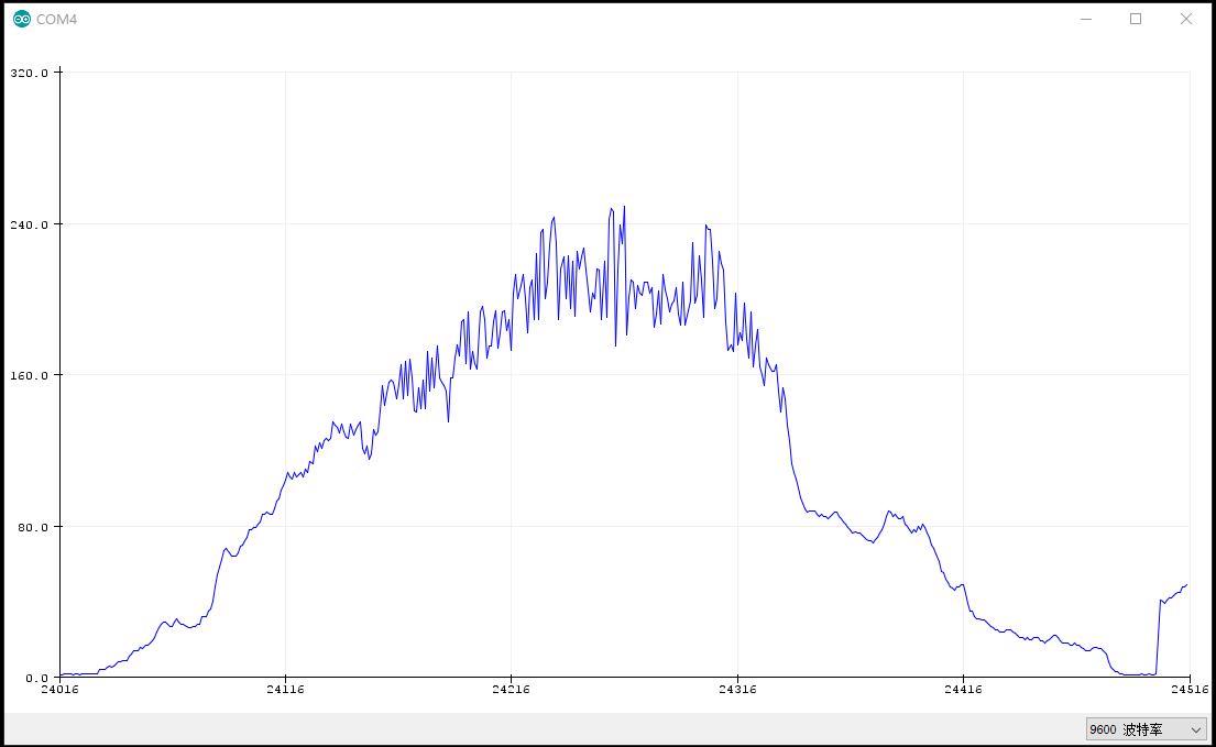 将太阳电池正极接到Arduino的A0端,用来检测输出的模拟量电压值。打开IDE1.8.9的工具---串口绘图器,就能看到串口输出的波形了。