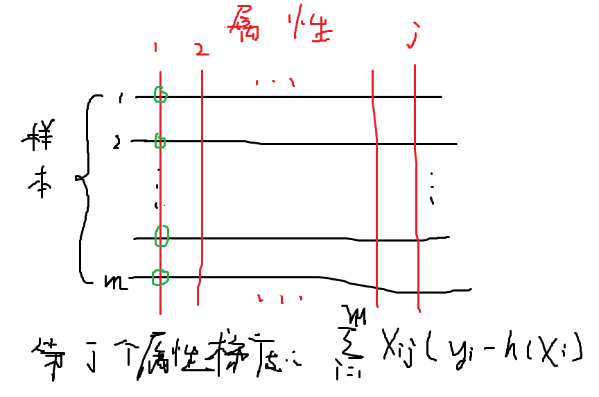 由上式可以看出,逻辑回归的参数W的梯度是每个样本标签值与其计算值的偏差乘以该样本的对应值,然后对所有样本累计求和,如下图所示。
