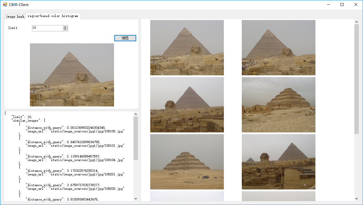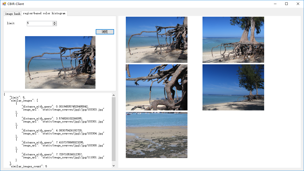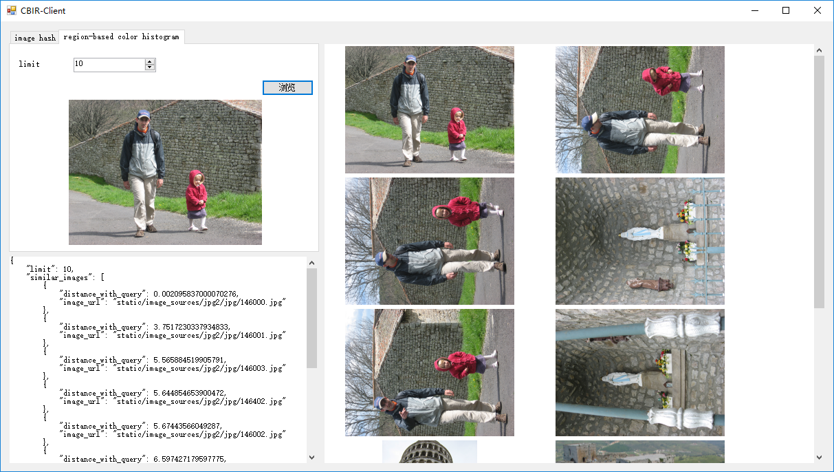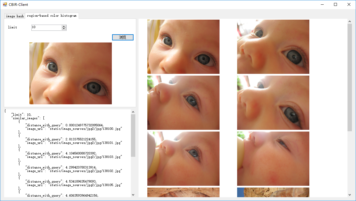 最后有一个demo,基于图像感知哈希(ahash、phash以及dhash)和基于区域的颜色直方图,完成了一个简单的图片搜索demo。服务端采用Python、Flask开发。