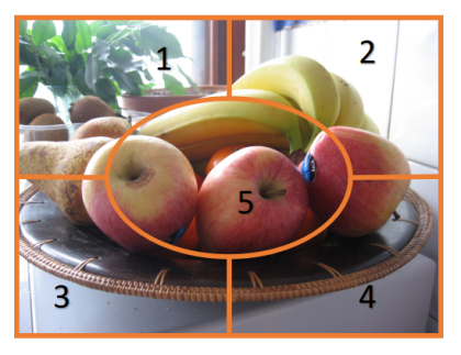 如上图,将原始图片划分成5个子区域,依次计算每个子区域的颜色直方图数据。图片是RGB三通道,每个通道依次分成(8,3,12)个区间,那么每个子区域颜色直方图就可以使用8*3*12=288维向量表示。而我们又将原始图片划分成了5个子区域,那么整张图的特征就需要用 8*3*12*5 = 1440维向量来表示了。
