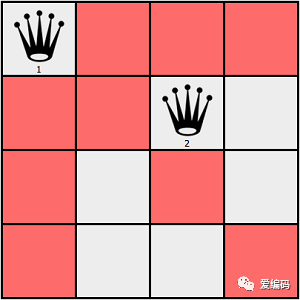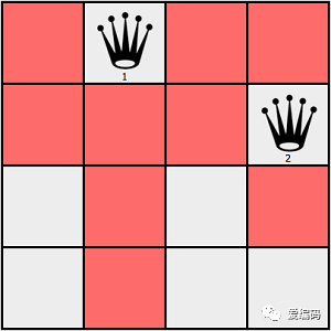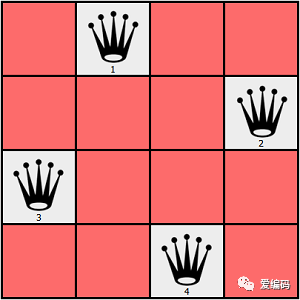 演算推理:八皇后比较多,那么先从4皇后(在4X4的棋盘上放4个皇后)开始