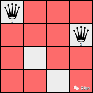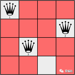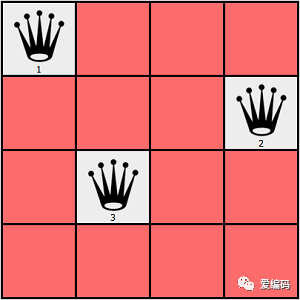 经过计算,第3行的所有棋格已经全部处于第1个和第2个皇后的联合攻击范围内了,虽然第4行还有空位,但已经无关紧要,当前尝试可以宣告 Game Over 了。