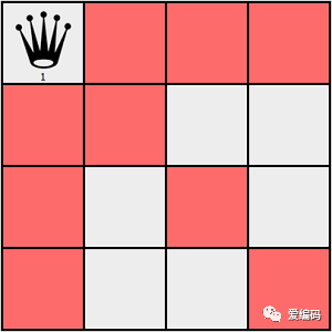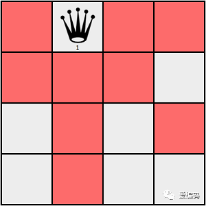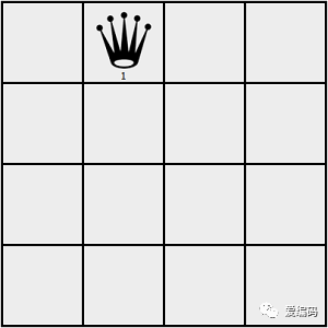 一开始,棋盘是空的,第1个皇后可以任意放置,但为了思考方便,最好是按照秩序来尝试,于是先将第1个皇后放置在棋盘第1行第1列格子里。