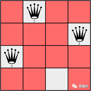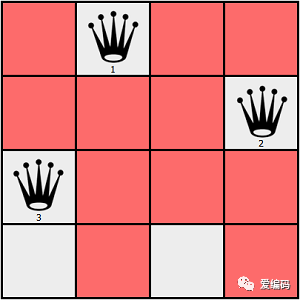 此时,第3行有一个可用的空位,于是将第3个皇后放在这个棋格中。