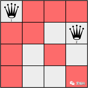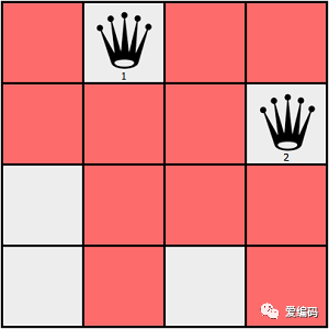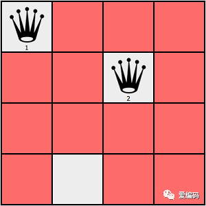 现在,第1行和第2行都有皇后了,重新计算棋盘状态,以寻找第3行的皇后位置。