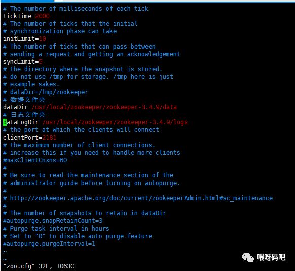 7、用 vim 打开 zoo.cfg 文件并修改其内容为如下: