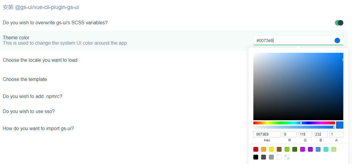 尽管我觉得vue-cli-plugin-element可以做得更好,比如自定义选择需要添加的组件,自定义主题色(vue ui的交互页面其实是提供了颜色选择器的,如下图),模板选择等