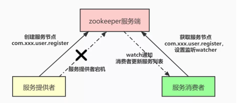 服务通知:一旦服务提供者因某种原因宕机不再提供服务之后,客户端与zookeeper服务端断开连接,zookeeper服务端上服务提供者对应服务节点会被删除(例如:用户注册服务com.xxx.user.register),随后zookeeper服务端会异步向所有消费用户注册服务com.xxx.user.register,且设置了watch监听的服务消费者发出节点被删除的通知,消费者根据收到的通知拉取最新服务列表,更新本地缓存的服务列表。