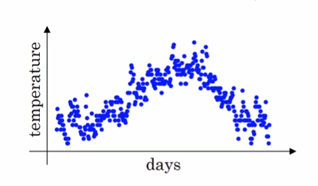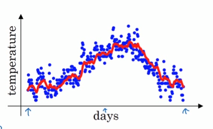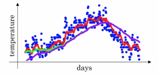 这个时候我们要用一个曲线来拟合这个散点图,则曲线某一天的$y$值可以用某一天的温度的局部平均值来替代,假设我们有前i-1天的温度,这时候要来估计第$i$天的温度$\theta _{i}$,我们可以用第$i$天的前$k$天的平均温度替代,如:$\theta _{i}^{'}=\frac{\theta _{i}+...+\theta _{i-k}}{k}$。