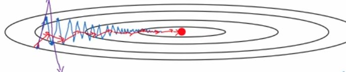 momentum梯度下降的梯度拟合轨迹可以看成是下图的红色线,参考指数加权平均的作用是使得数据更平滑,所以可以使得蓝色曲线在纵向上的波动更小,因为纵向上的加权平均有很大一部分可以相互抵消(梯度是矢量,方向相反的梯度可以相互抵消),而在水平方向上的速度不变,效果比普通的梯度下降好。