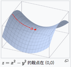 鞍点就是:一个光滑函数的鞍点邻域的曲线,曲面,或超曲面,都位于这点的切线的不同边。例如这个二维图形,像个马鞍:在x-轴方向往上曲,在y-轴方向往下曲,鞍点就是(0,0),红色线为拟合曲线,最后会在红点处震荡,如下图。
