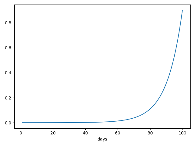 那么加权的样本量怎么确定呢,一般是做如下限定:权值为$\beta^{k}< \frac{1}{e}=0.367879$的数据不加入到加权中,$e$为自然对数的底数。这样限制之后指数函数的曲线在第$k$天之后高度会降到原来的$\frac{1}{e}$。样本量可以根据$k=\frac{1}{1-\beta }$来求。这个公式的推导如下: