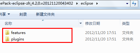 这里使用的是Link方式来安装插件,首先打开Eclipse程序目录,我们可以看到有两个文件夹:features和plugins,如图: