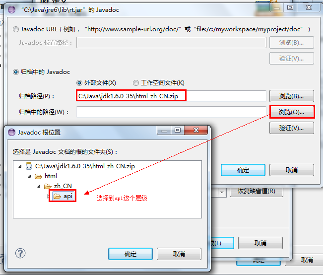 选择归档中的javadoc,这样就不用解压缩了,在归档路径中选择下面的中文JavaDoc路径,归档中的路径中一直选择到"api"这个层级: