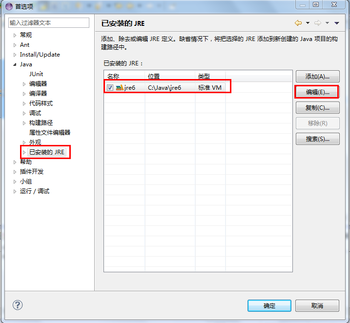 除了设置中文的API文档外,和.NET 不同我们还可以在Eclipse中直接查看Java类库的源码。下载好中文JavaDoc文档后,存在任意路径,打开Eclipse,选择"首选项"——>>"已安装的JRE",选择一个JRE版本——>>"编辑",如下: