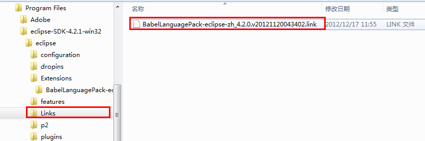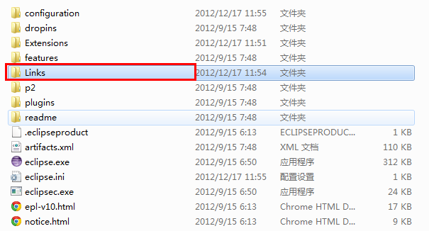 在Eclipse主目录中创建一个名为:Links的文件夹,这是一个Eclipse的标准目录,启动Eclipse时它会预先读取里面的内容,我们通过在里面添加插件的链接,使得Eclipse可以读取并加载链接对应的插件。