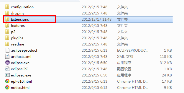1.2.1 首先在Eclipse主目录下创建存放插件的文件夹,文件名任意不和目录中文件夹名称冲突即可,着这里我创建了一个:Extensions文件夹: