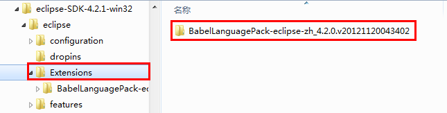 将中文语言包解压后,可以看到有两个和前面目录名称相同的目录,将这两个目录中的文件复制到Eclipse对应的目录即可。