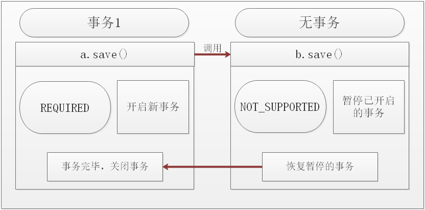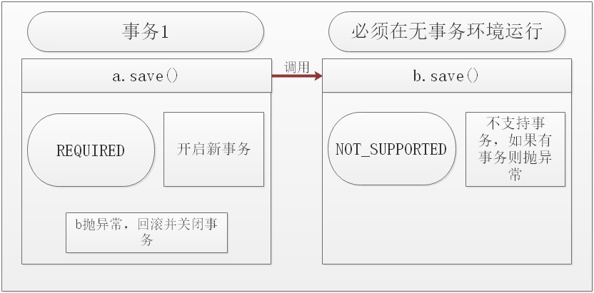 顾名思义不支持事务,当处于存在事务的上下文环境中运行时,b.save()会暂停当前已开启的事务,意味着a.save()的事务被挂起直至b.save()以非事务方法运行完毕后,a.save()的事务继续执行。