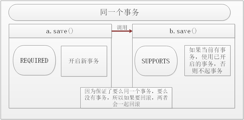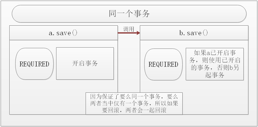 默认的spring事务传播级别,使用该级别的特点是,如果上下文中已经存在事务,那么就加入到事务中执行,如果当前上下文中不存在事务,则新建事务执行。如下图: