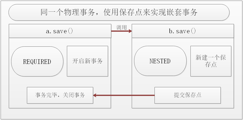 Nested使用JDBC 3的保存点实现,即如果使用低版本驱动将导致不支持嵌套事务