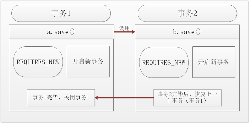 总是会创建一个新事务(包括物理事务),该传播级别的特点是,每次都会新建一个事务,并且同时将上下文中的事务挂起,执行当前新建事务完成以后,上下文事务恢复再执行。如下图: