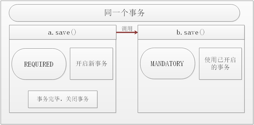 下面以a.save()里调用了b.save()举例,事务方法之间调用时事务如何传播。