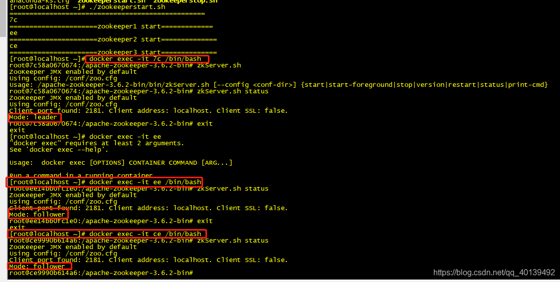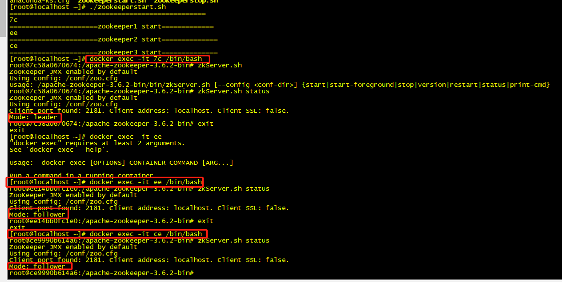 启动后分别进入容器,如下图,可以看到,zookeeper为leader,zookeeper2和zookeeper3为follower