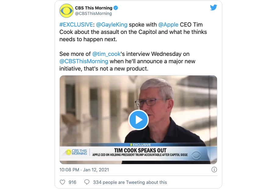 国会暴动之后,苹果CEO库克在最近的一次采访中表达了对该事件的看法:关键是要让人们为上周在美国国会大厦发生的事情负责。