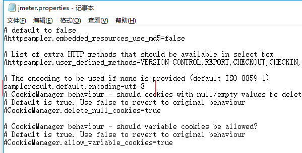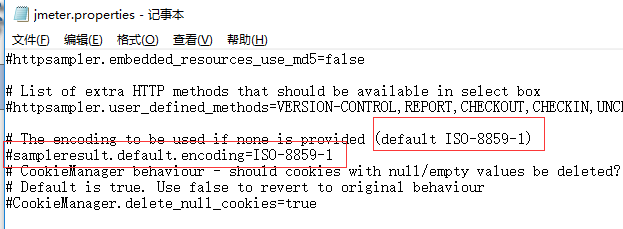将ISO-8859-1修改成utf-8,去掉注释符号,重启Jmeter